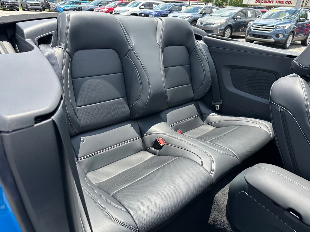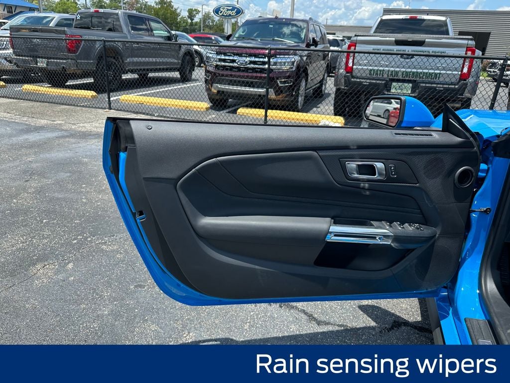Comfort and style are equally important in the Mustang EcoBoost Premium. Heated front seats, a power convertible roof, and a leather-wrapped steering wheel create an inviting and refined cabin experience. The 18-inch machined-face aluminum wheels and rain-sensing wipers add a touch of sophistication to the exterior, while the glass rear window and rear parking sensors enhance both form and function.