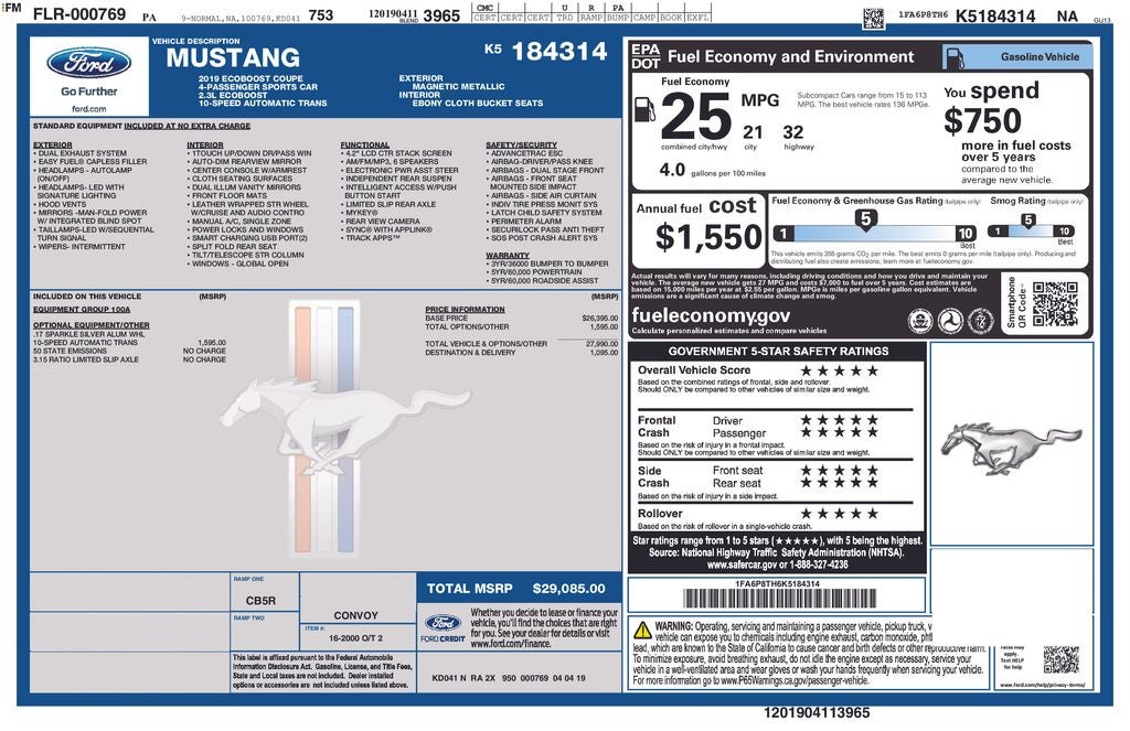 The heart of this Mustang is the powerful EcoBoost 2.3L I4 GTDi DOHC Turbocharged VCT engine, delivering an impressive 21 city and 31 highway MPG. With rear-wheel drive and the smooth-shifting 10-speed automatic transmission, you'll experience the perfect balance of exhilaration and efficiency.